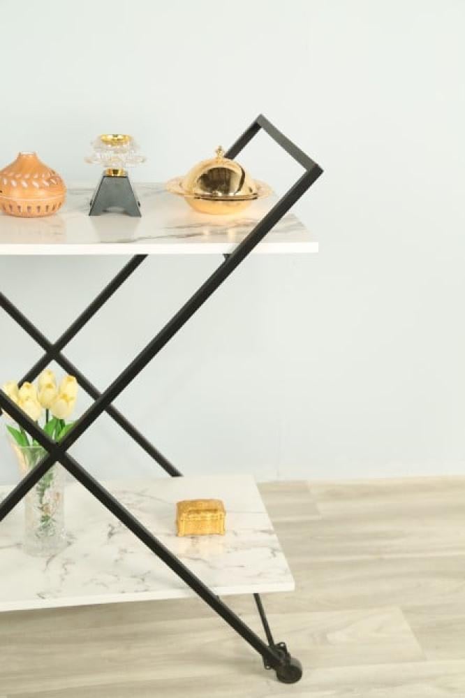 عربه تقديم شكل اكس سطح خشب ابيض شبيه بالرخام عرض